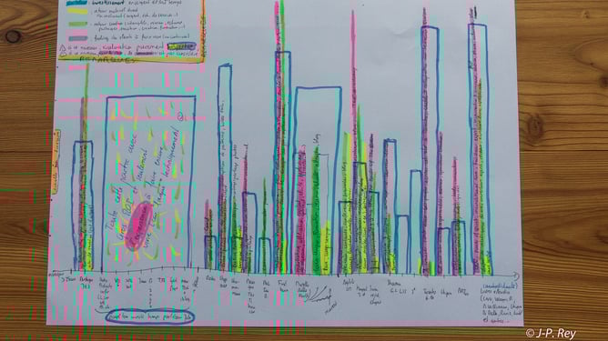 J’ai donc pris une feuille blanche puis ai tracé, au bas de la feuille, sur sa largeur, une ligne qui représente la ligne du temps. Puis j’ai commencé à y insérer toutes les formations, cours, conférences suivies depuis que je suis actif dans ma vie professionnelle. Première partie déjà fort intéressante pour moi, car ça m’a permis de re-vivre, de re-sentir le plaisir associé à certaines formations bien anciennes. Et également de me souvenir de l’une ou l’autre formation oubliée… J’ai fait l’exercice avec des formations (car j’en ai déjà beaucoup) mais il pourrait tout à fait être réalisé avec des rencontres marquantes, avec des lectures marquantes, avec vos expériences marquantes, ou d’autres éléments auxquels je n’ai pas songé…